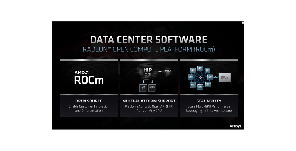 Software! ROCm, now version 4.0. Open source, multi platform, and highly scalable. Easy to port CUDA to HIP code. ROCm 4.0 is great for ML and HPC, and will be used for the exascale supercomputer! Remember that DOE is paying for software development, with $100M each for Frontier and El Capitan.