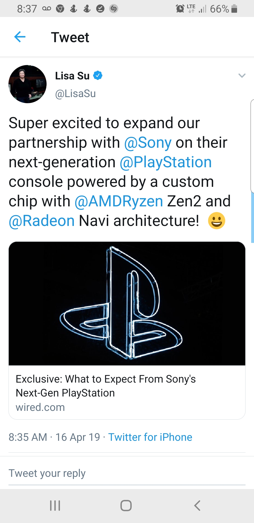 Lisa Su twitted PS5 will have Zen2 and Radeon Navi architecture and the Wired article covering this news. https://www.wired.com/story/exclusive-sony-next-gen-console/ Even though I fully expected this, but there hasn't been any confirmation from AMD until now. Neither Zen2 nor Navi have yet to be launched. Certainly this is a great leap in turns of computing power… Continue reading 4/16/19 Lisa Su Confirmed PS5 With Zen2 and Navi! AMD 27.33 to 27.93